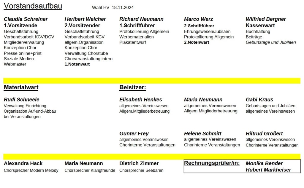 In der Mitgliederversammlung vom 18.11.2024 waren die einjährigen Ämter neu zu wählen und wurden wie folgt besetzt: